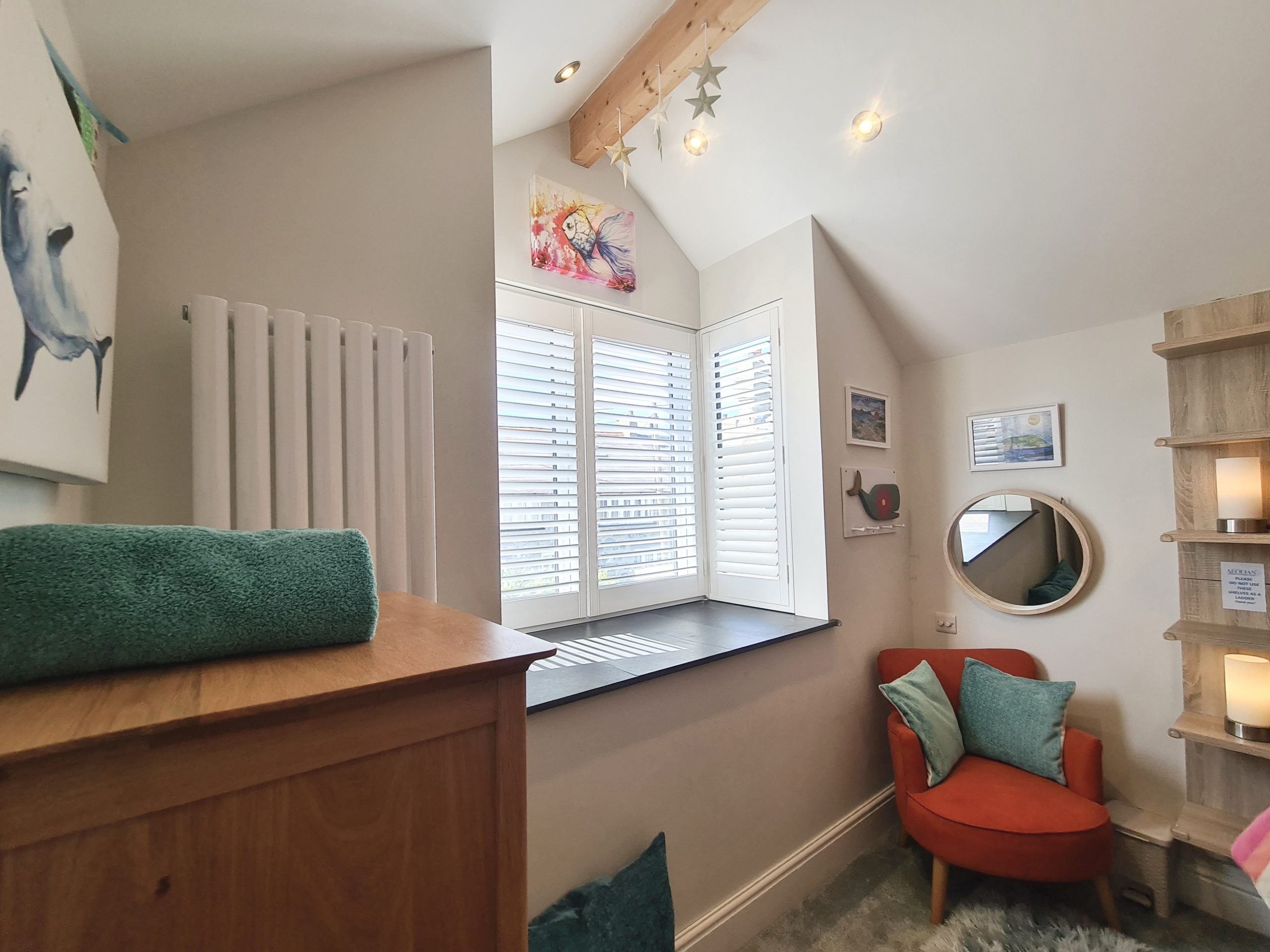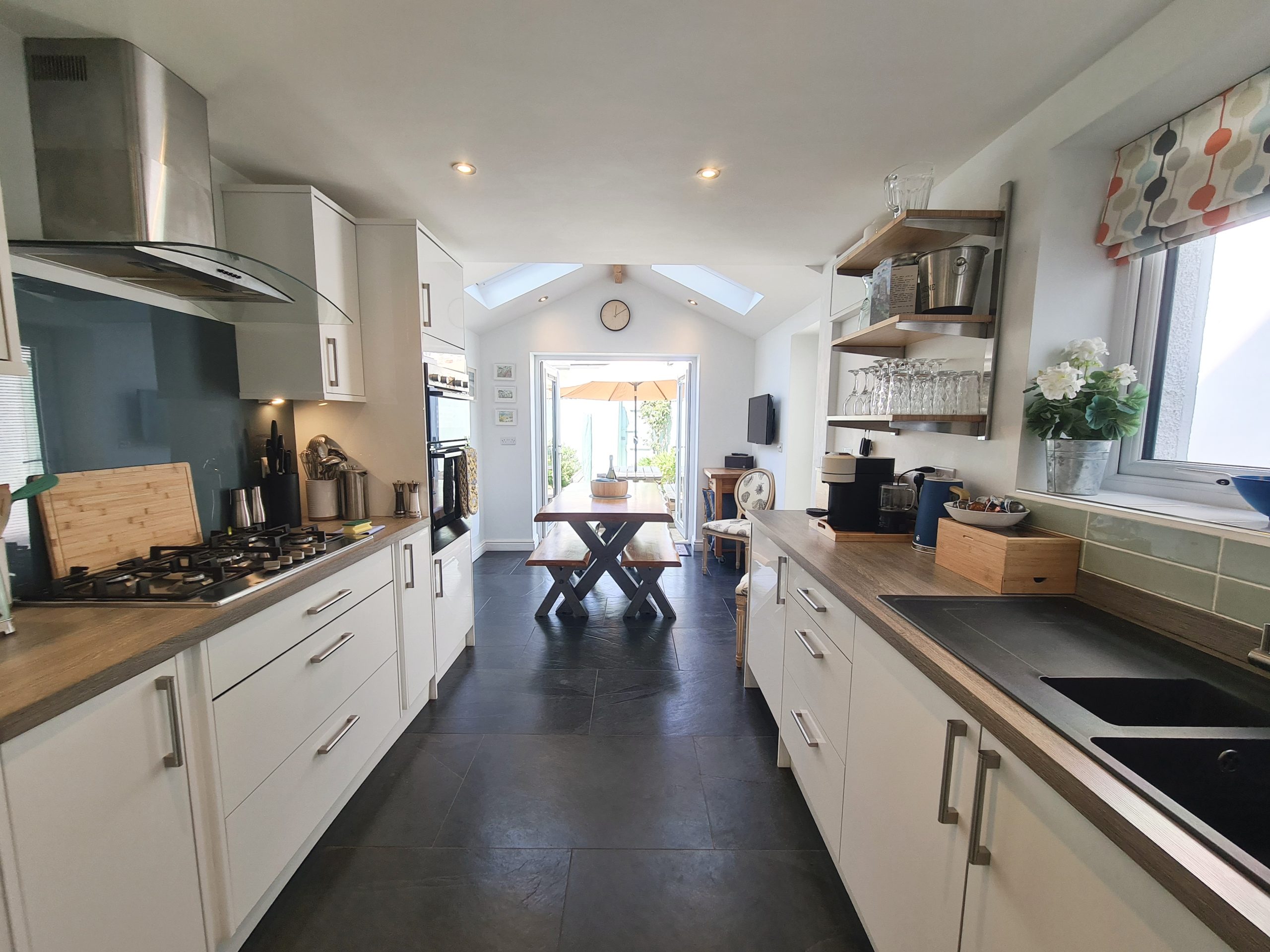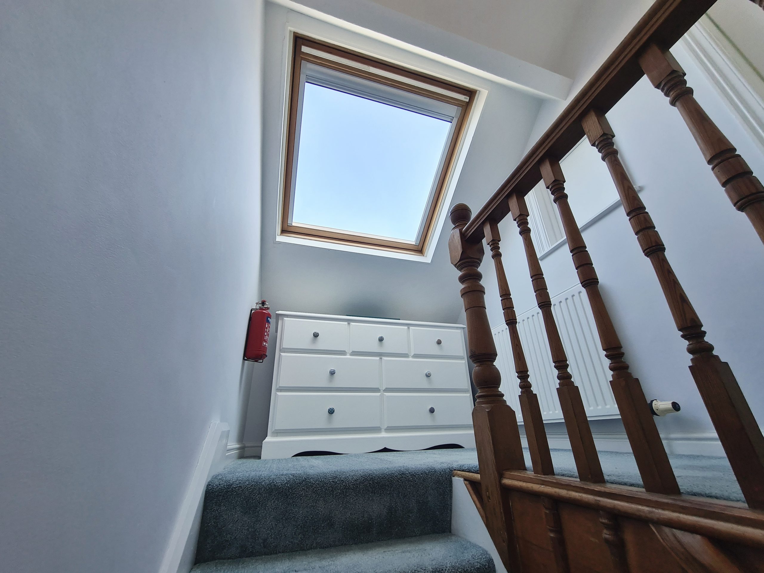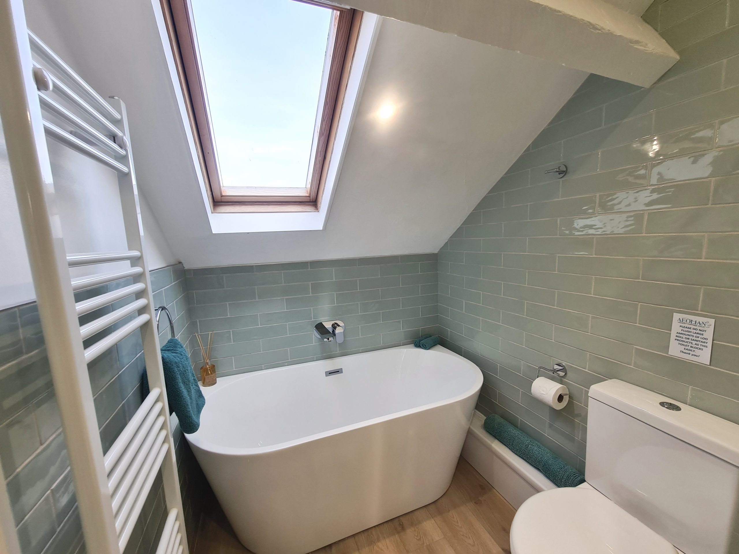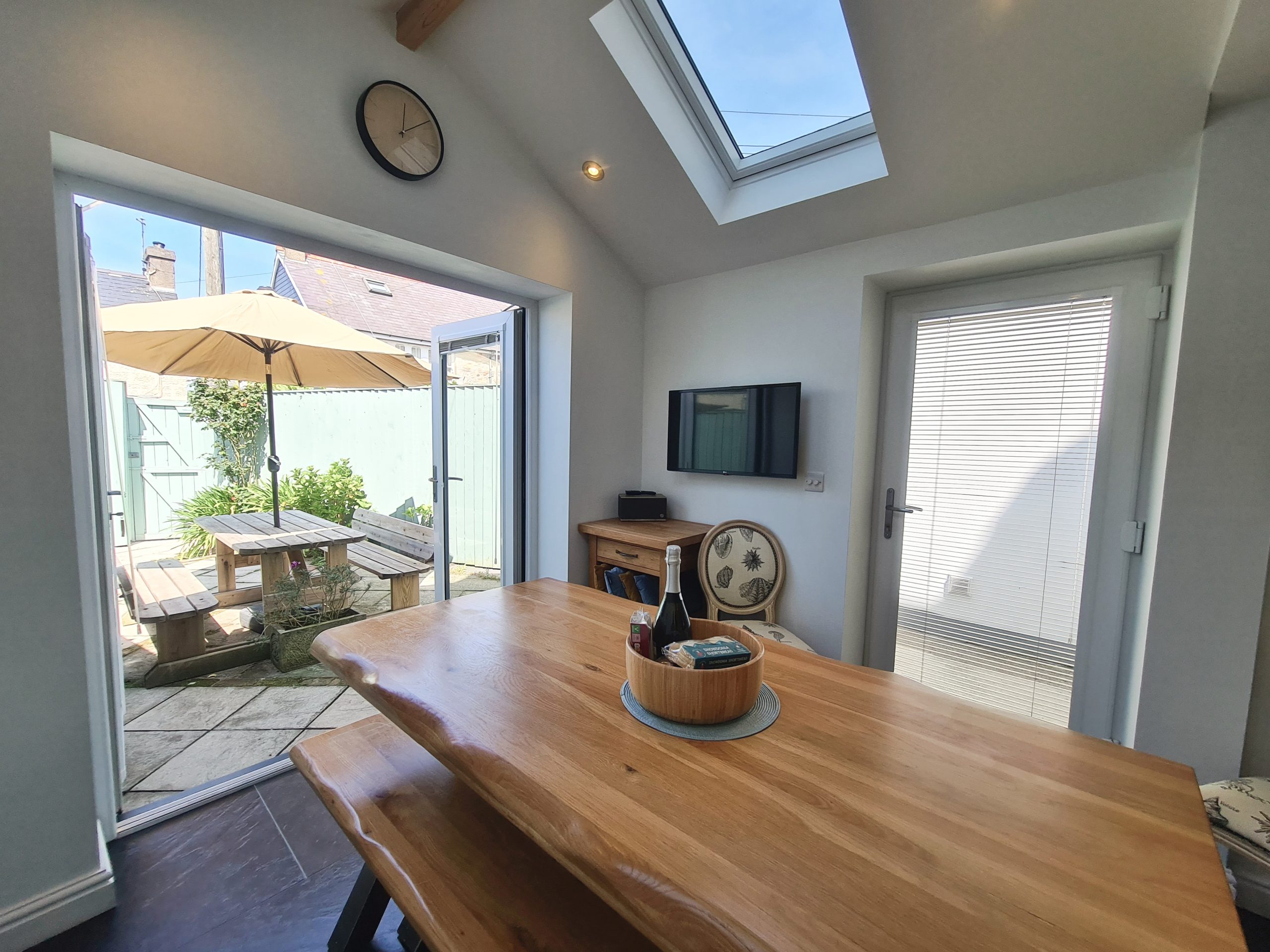 Twin Velux above oak table, Smart TV and Bluetooth speaker. Eat in or out!