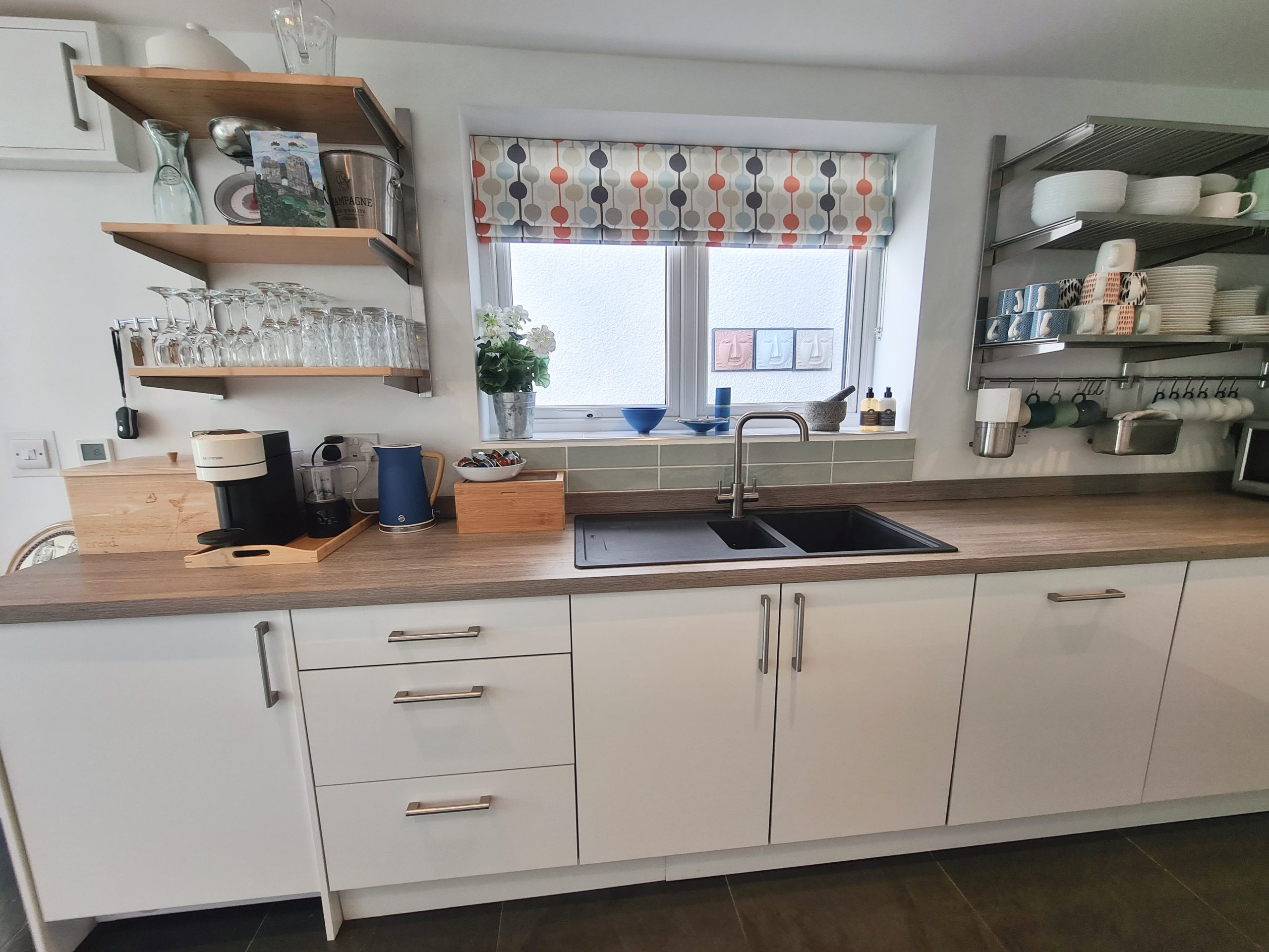 Ample dinner ware and cutlery plus kettle, coffee machine and milk frother.