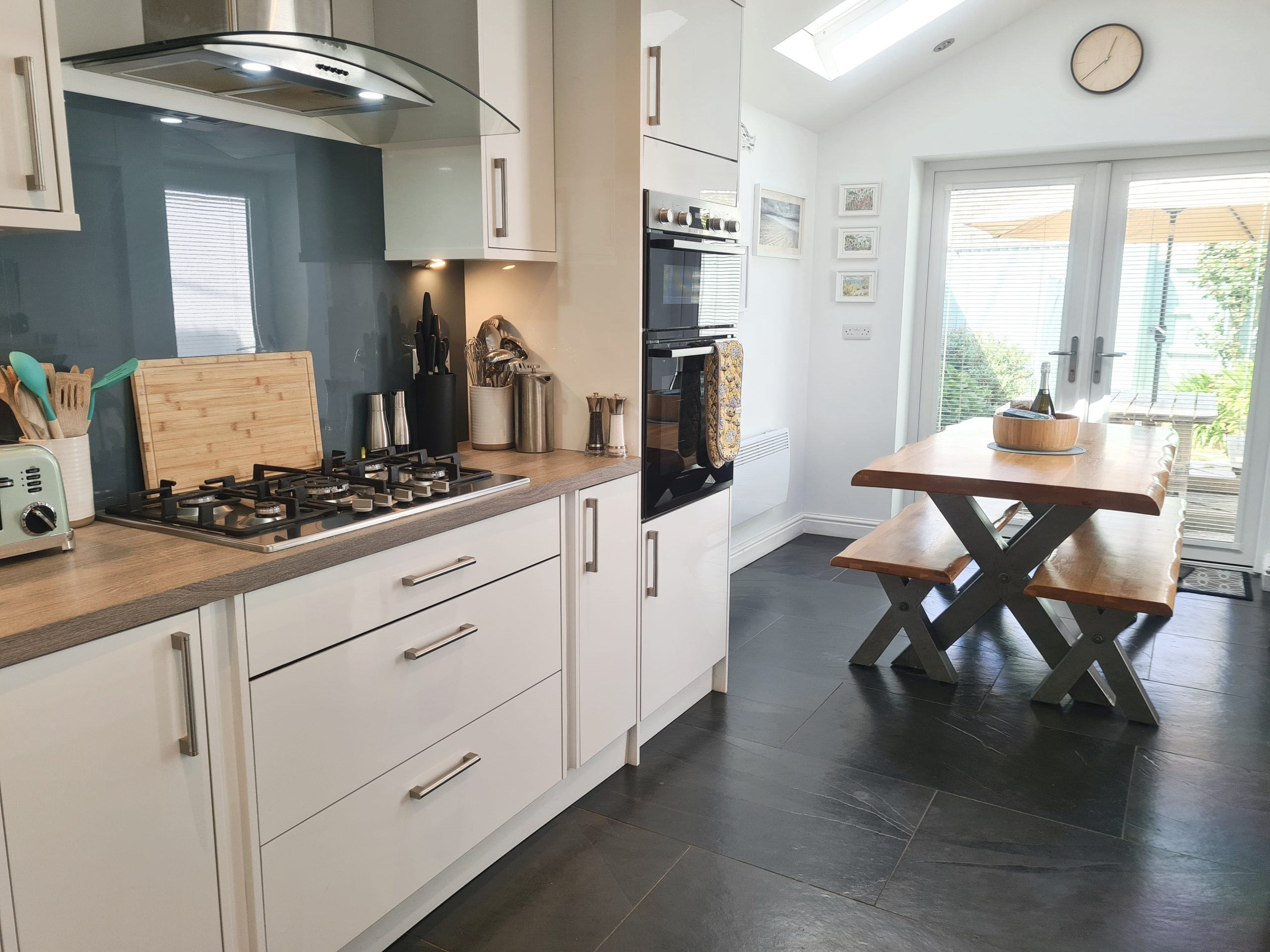 White gloss furniture, 5-burner gas hob, double electric oven. and microwave.